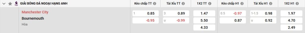Đây là một cuộc đối đầu hấp dẫn giữa City của Guardiola và Bournemouth, đội bóng đã thi đấu rất ấn tượng trong mùa giải này. Quả thực, The Cherries đang xếp trên đội chủ nhà trên bảng xếp hạng Ngoại hạng Anh và chắc chắn là một đội bóng có khả năng giành một suất dự cúp châu Âu. Nhà cái vẫn đánh giá cao Man City hơn trong trận đấu này nhờ thành tích tốt tại sân nhà và sự thiếu ổn định của Bournemouth tại sân khách. Tuy nhiên, Cherries vẫn đang thể hiện khá tốt và không mất điểm tại đây.
